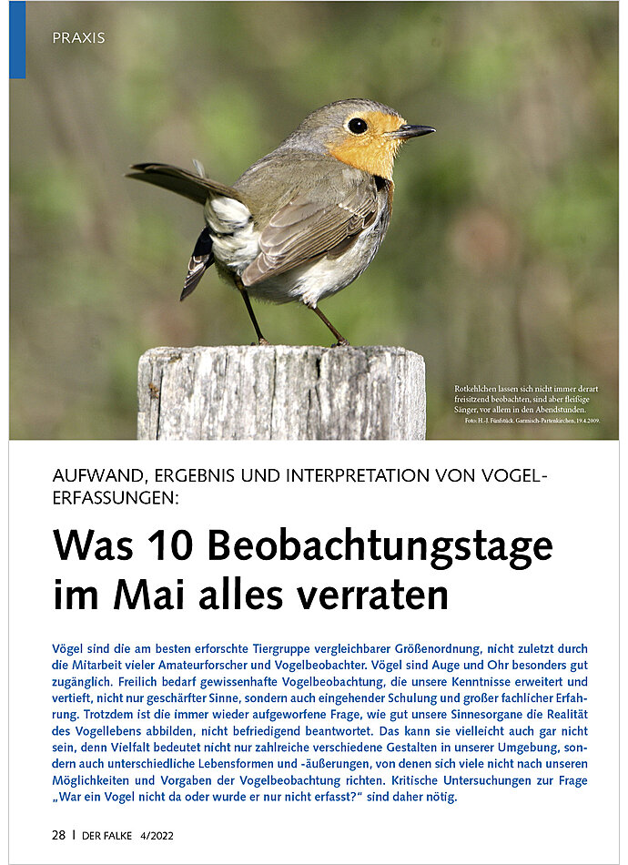 Vögel sind die am besten erforschte Tiergruppe vergleichbarer Größenordnung, nicht zuletzt durch die Mitarbeit vieler Amateurforscher und Vogelbeobachter. Vögel sind Auge und Ohr besonders gut zugänglich. Freilich bedarf gewissenhafte Vogelbeobachtung, die unsere Kenntnisse erweitert und vertieft, nicht nur geschärfter Sinne, sondern auch eingehender Schulung und großer fachlicher Erfahrung. Trotzdem ist die immer wieder aufgeworfene Frage, wie gut unsere Sinnesorgane die Realität des Vogellebens abbilden, nicht befriedigend beantwortet. Das kann sie vielleicht auch gar nicht sein, denn Vielfalt bedeutet nicht nur zahlreiche verschiedene Gestalten in unserer Umgebung, sondern auch unterschiedliche Lebensformen und -äußerungen, von denen sich viele nicht nach unseren Möglichkeiten und Vorgaben der Vogelbeobachtung richten. Kritische Untersuchungen zur Frage "War ein Vogel nicht da oder wurde er nur nicht erfasst?" sind daher nötig.Zurück