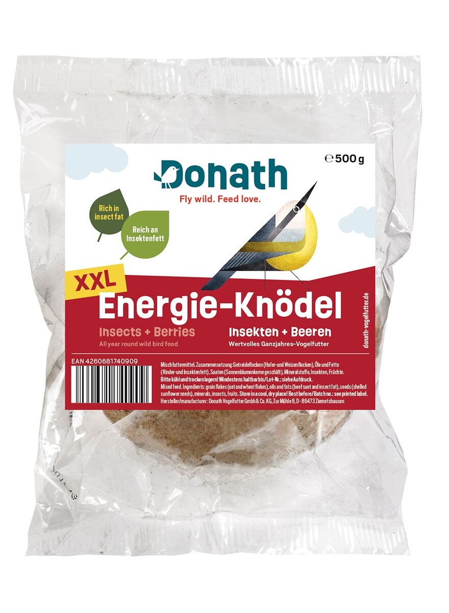 Gönnen Sie Ihren Gartenvögeln einen ganz besonderen Leckerbissen! Der Energieknödel ist reich an ungesättigten Fettsäuren und dadurch besonders wertvoll. Zusammensetzung: Getreideflocken (Hafer und Weizen), Öle und Fette (Rinderfett und Sonnenblumenöl), Nüsse (Erdnüsse und Hanfsamen), Mineralstoffe, Insekten und Früchte. 500-Gramm-Knödel - passend zum »Futterhaus für Energie-Knödel XXL« (Bestellnummer: 7777185, bitte separat bestellen). Donath.Herstellerinformationen: