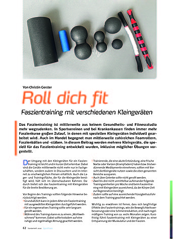 Das Faszientraining ist mittlerweile aus keinem Gesundheits- und Fitnessstudio mehr wegzudenken. In Sportvereinen und bei Krankenkassen finden immer mehr Faszienkurse großen Zulauf, in denen mit speziellen Kleingeräten individuell gearbeitet wird. Auch im Handel begegnet man mittlerweile zahlreichen Foamrollern, Faszienbällen und -stäben. In diesem Beitrag werden mehrere Kleingeräte, die speziell für das Faszientraining entwickelt wurden, inklusive möglicher Übungen vorgestellt.Zurück